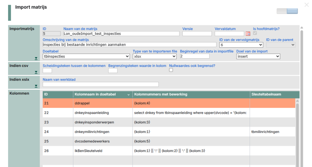 Voor alle overige velden in tbinspecties die benodigd zijn (in ons voorbeeld zijn dat ddrappel, dnkeyinspaanleiding, dnkeyinsponderwerpen, dnkeymilinrichtingen en dvcodemedewerkers) maken we ook een regel aan in de importmatrijsregeltabel.