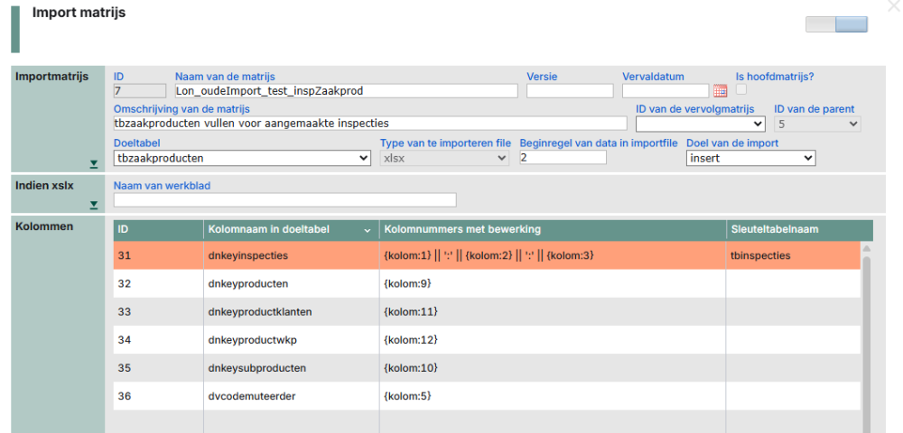 Tevens moet er 1 importmatrijsregel aangemaakt worden die ervoor zorgt dat er na iedere insert in tbinspecties, de dnkey van de aangemaakte kaart in tbinspecties als vaste sleutelwaarde wordt opgeslagen in tbimportsleutels.