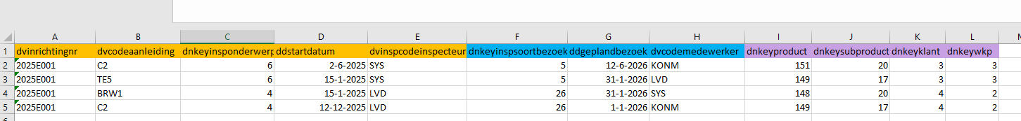 In het hier beschreven voorbeeld wordt uitgegaan van dat iedere regel in het bestand (minus de kopregel) gegevens bevat benodigd voor zowel het aanmaken van een inspectietraject, als het bezoek en eerste product onder deze inspectie.