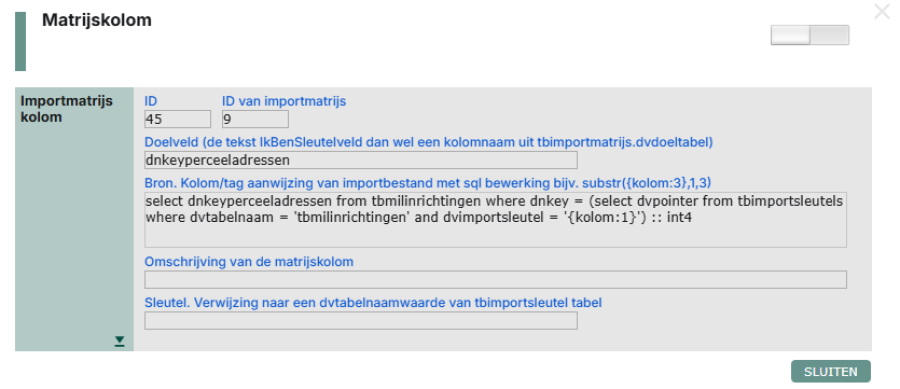 dnkeyperceeladressen - Kolomnummers(s) met bewerking uit importbestand: de bron/kolombewerking staat hier. In het voorbeeld zullen we de dnkey van het perceeladres gaan ophalen bij de inrichting/locatiedossier waaronder de toezichtzaak moet worden aangemaakt. Hiervoor moeten we een select statement schrijven dat bij de juiste tbmilinrchtingen.dnkey, de dnkeyperceeladressen ophaalt. De tbmilinrchtingen.dnkey gaan we ophalen uit de sleuteltabel: hiervoor hebben we eerder als zoeksleutel in tbimportsleutels het inrichtingnummer opgeslagen. Het inrichtingnummer van de inrichting/locatiedossier staat vervolgens in kolom 1 van het CSV bestand. De uiteindelijke waarde voor dit veld in de matrijsregel wordt dan