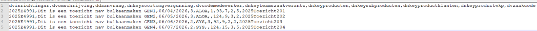 In het voorbeeld op deze pagina wordt uitgegaan van een CSV bestand met daarin een kopregel die aangeeft welke kolom, welke waarde voorstelt en daaronder regels met de gegevens voor de aan te maken toezichtzaken. De kopregel is niet verplicht: men mag ook gelijk beginnen met vanaf de eerste regel de in te lezen waardes.