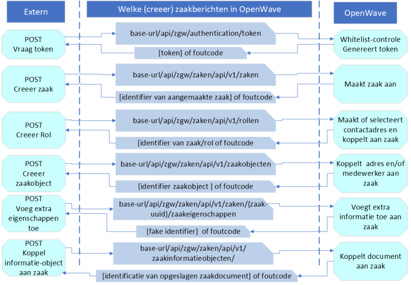 Op het endpoint base-url/api/zgw/zaken/api/v1/zaken/ kan een POST worden geplaatst waarmee OpenWave een nieuwe zaak kan aanmaken. Bij succes wordt de responsecode 201 geretourneerd met in de body onder meer de uitgetrokken unieke UUID-code voor de zaak, waarmee in een vervolgbericht een contactrol kan worden aangemaakt en waarmee één of meer geüploade documenten aan deze zaak kunnen worden gekoppeld.
