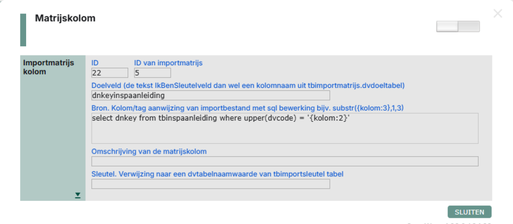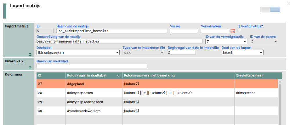 insert into tbimportsleutels(dvtabelnaam,dvpointer,dvimportsleutel) values (doeltabel van de importmatrijs dus in het voorbeeld: tbinspecties, de dnkey van de net aangemaakte regel in tbinspecties, de waarde van de inhoud van {kolom:1} || ':' || {kolom:2} || ':' || {kolom:3})
