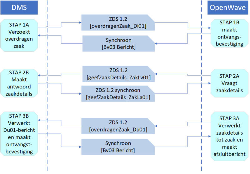 OpenWave vraagt aan het externe Zaak/DMS systeem de zaakgegevens op. Uit het ontvangen overdragenZaak_diO1 bericht worden twee gegevens gebruikt: de Zender: <stuurgegevens><zender><organisatie> en de Dmszaakidentificatie: <object><identificatie>.